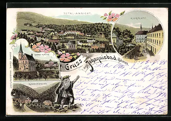 Lithographie Johannisbad i. Böhmen, Kurplatz, Kathol. Kirche, Klausengrund, Totalansicht