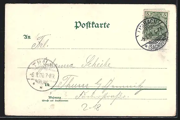 Personenbezogene Daten auf der Rückseite der Karte wurden durch blauen Textmarker unkenntlich gemacht. Die blauen Stellen sind auf die Vorderseite durchgeweicht und wirken sich negativ auf das Postkartenfoto aus