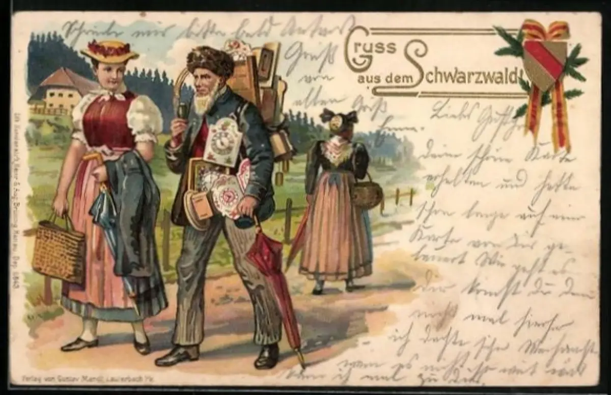 Lithographie Junge Schwarzwälderin läuft ein Stück mit dem Uhrenhändler