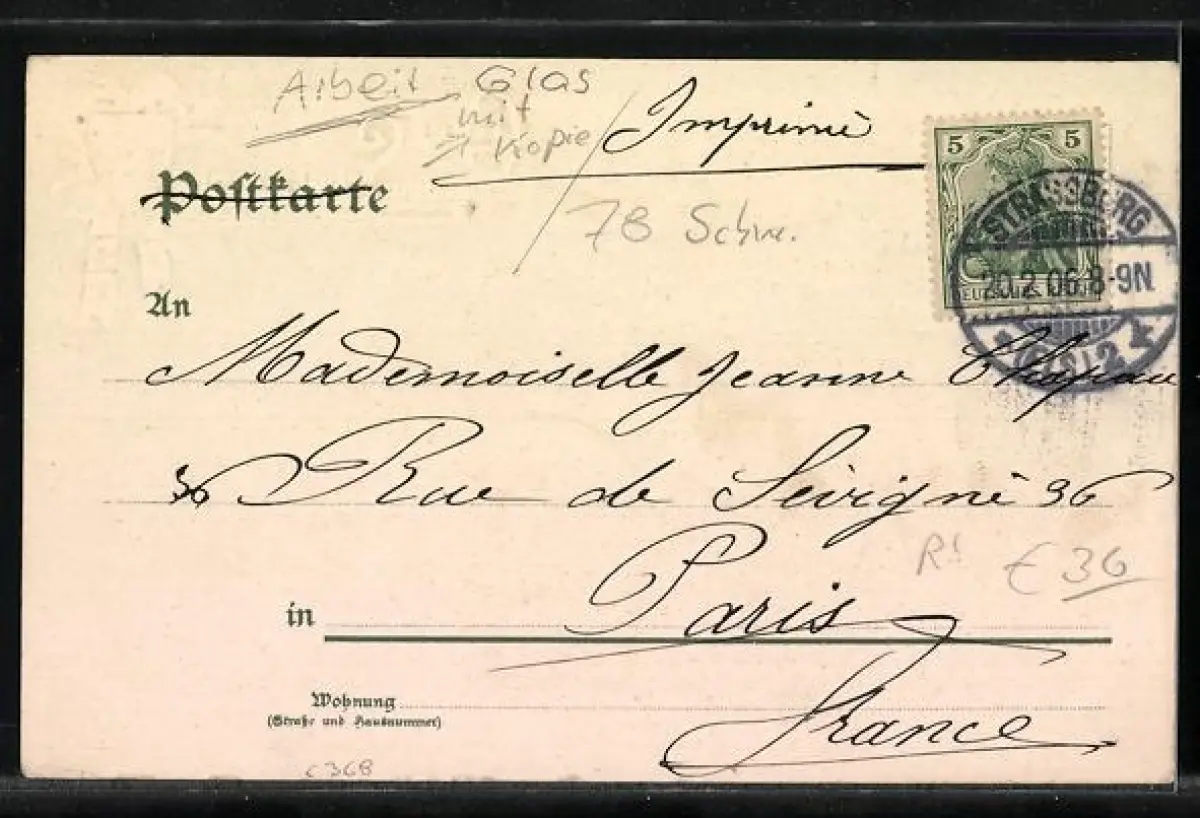 Personenbezogene Daten auf der Rückseite der Karte wurden durch blauen Textmarker unkenntlich gemacht. Die blauen Stellen sind auf die Vorderseite durchgeweicht und wirken sich negativ auf das Postkartenfoto aus