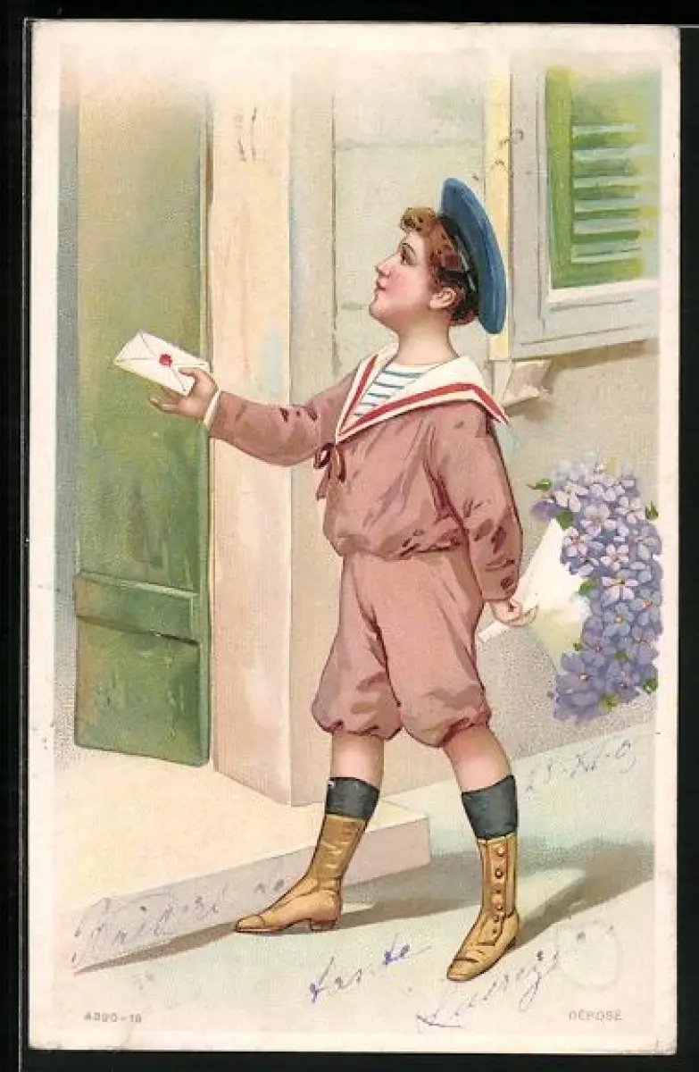 Lithographie Junge in Matrosenanzug bringt einen Brief und Blumenstrauss