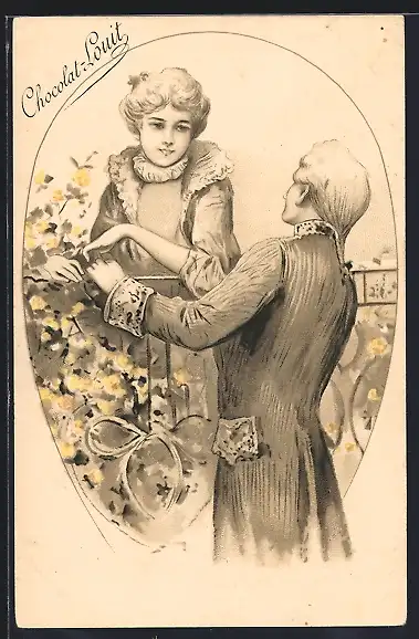 Lithographie Junger Mann macht einer Dame den Hof, Chocolat-Louit