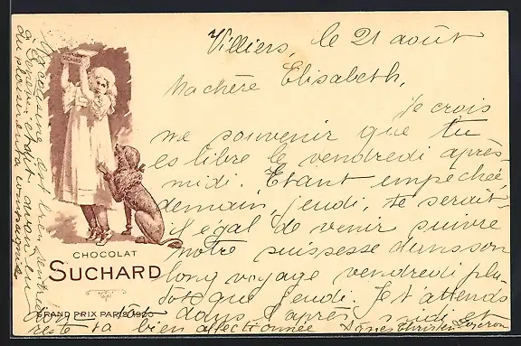 Lithographie Junges Mädchen hält die Box Chocolat Suchard von ihrem Hund fern