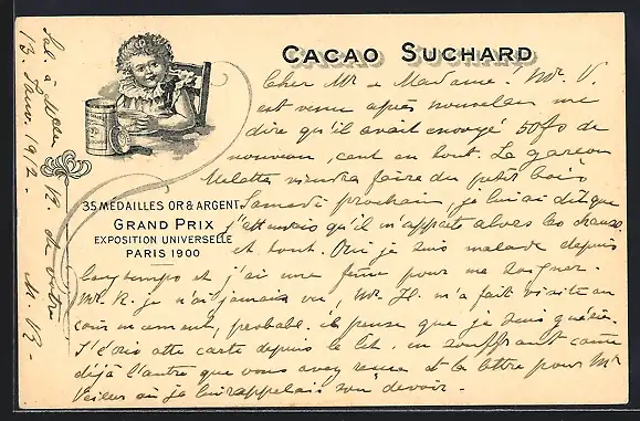 Lithographie Junges Mädchen mit einer Dose Cacao Suchard