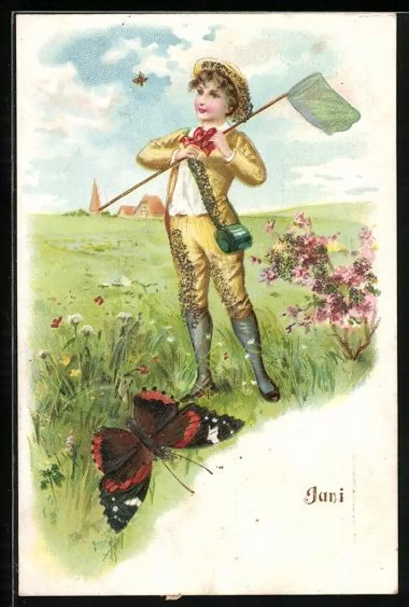 Lithographie Juni, Junger Schmetterlingsfänger mit Kescher und fliegende Schmetterlinge