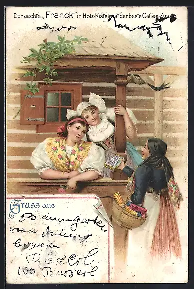 Lithographie Kaffee, Der aechte Franck in Holz-Kisteln ist der beste Caffee-Zusatz, Frauen in Trachten mit Verkäuferin