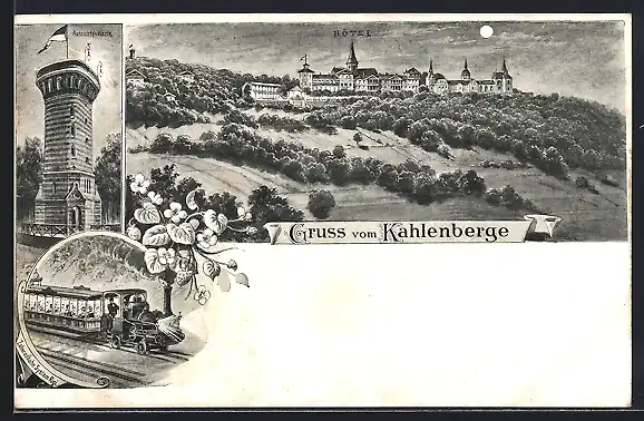 Lithographie Kahlenberg, Hotel bei Mondschein, Aussichtsturm, Zahnradbahn System Rigi
