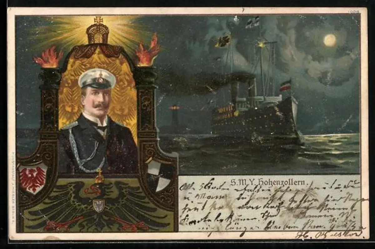 Lithographie Kaiserliche Yacht Hohenzollern in Fahrt bei Mondschein, Portrait Kaiser Wilhelm II.