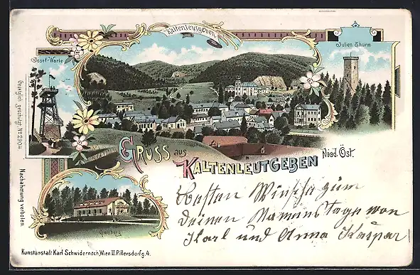 Lithographie Kaltenleutgeben, Josefwarte, Julienturm, Gasthaus Gaisberg