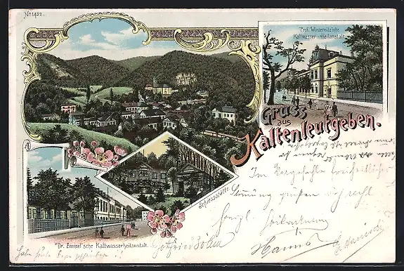Lithographie Kaltenleutgeben, Ortsansicht von oben, Schiessstätte, Dr. Emmel'sche Kaltwasser-Heilanstalt