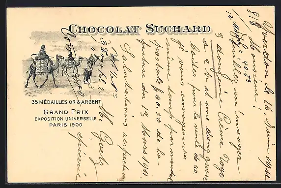 Lithographie Kamelkarawane mit einer Ladung Chocolat Suchard