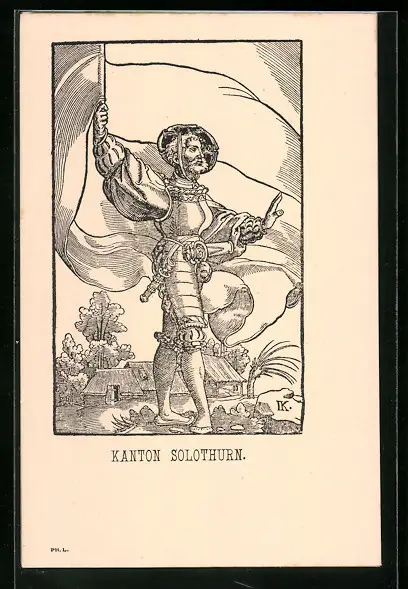 Lithographie Kanton Solothurn, Schweizer Soldat mit Fahne vor einem Gebäude