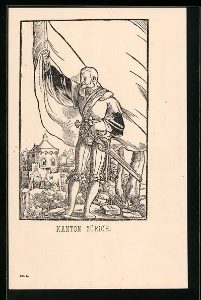 Lithographie Kanton Zürich, Schweizer Soldat mit Flagge und Schwert