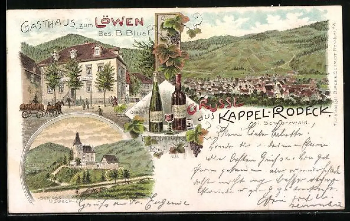 Lithographie Kappel-Rodeck i. Schwarzwald, Gasthaus zum Löwen, Bes. B. Blust, Schloss, Weinflaschen