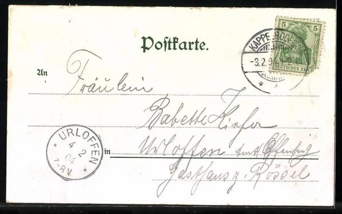 Personenbezogene Daten auf der Rückseite der Karte wurden durch blauen Textmarker unkenntlich gemacht. Die blauen Stellen sind auf die Vorderseite durchgeweicht und wirken sich negativ auf das Postkartenfoto aus