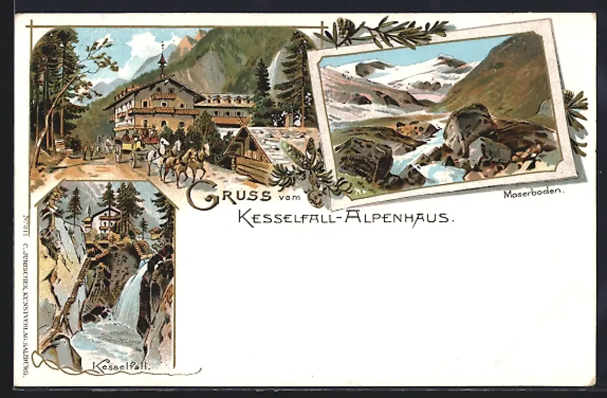 Lithographie Kaprun, Moserboden, Kesselfall-Alpenhaus, Kesselfall, Pferdegespann