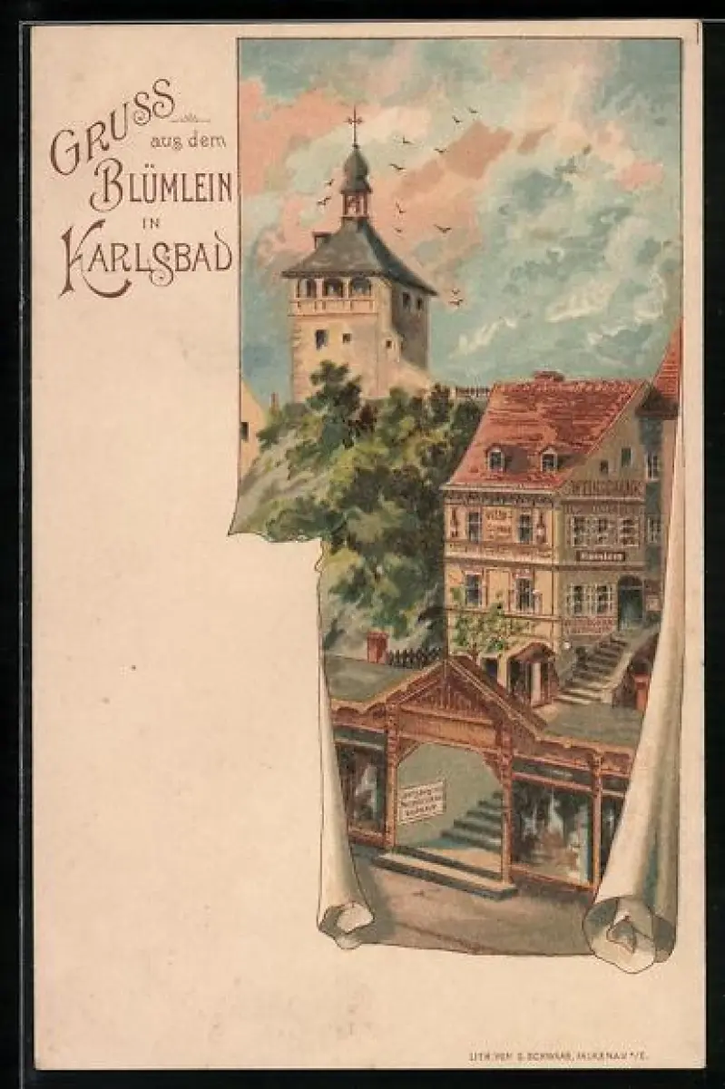 Lithographie Karlsbad, Blick auf das Gasthaus Blümlein