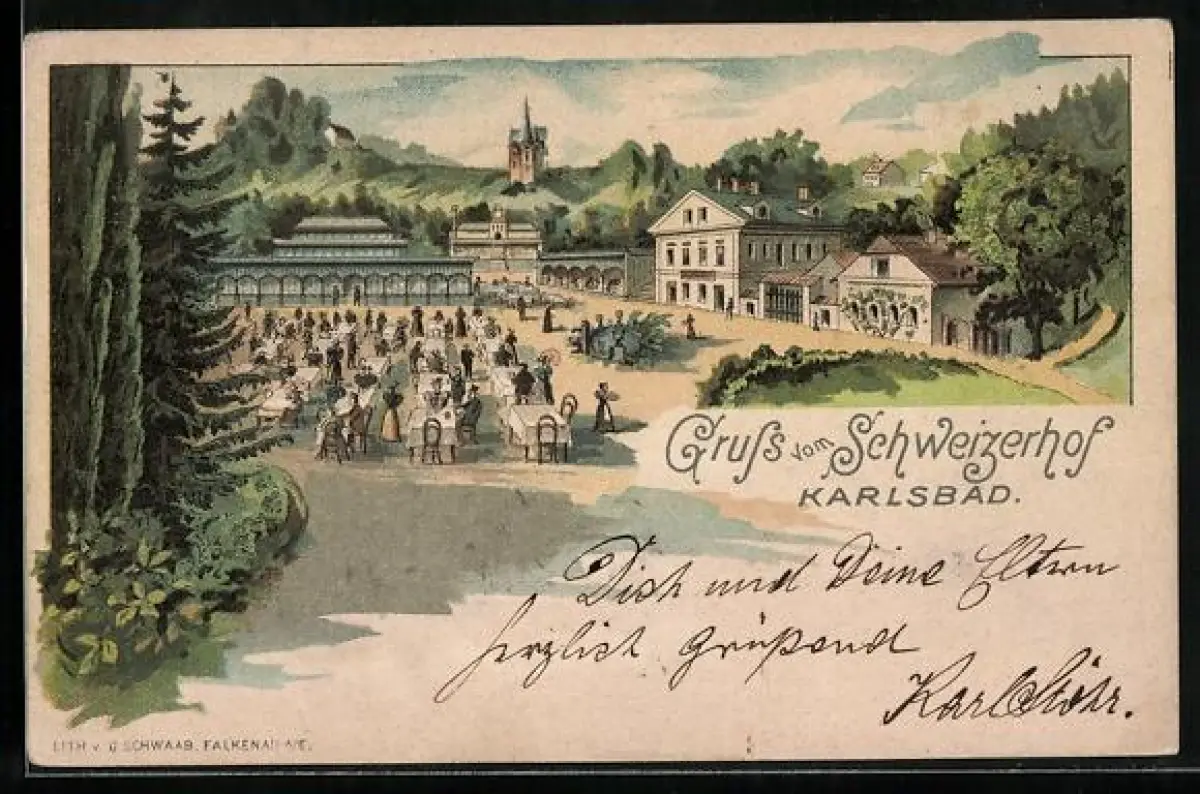 Lithographie Karlsbad, Blick auf den Gasthof Schweizerhof