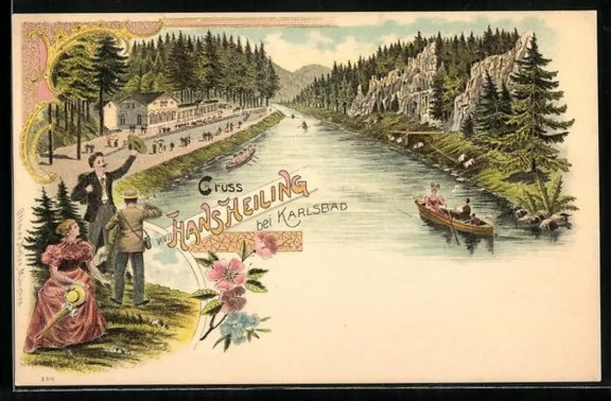 Lithographie Karlsbad, Gasthaus Hans Heiling, Ruderpartie