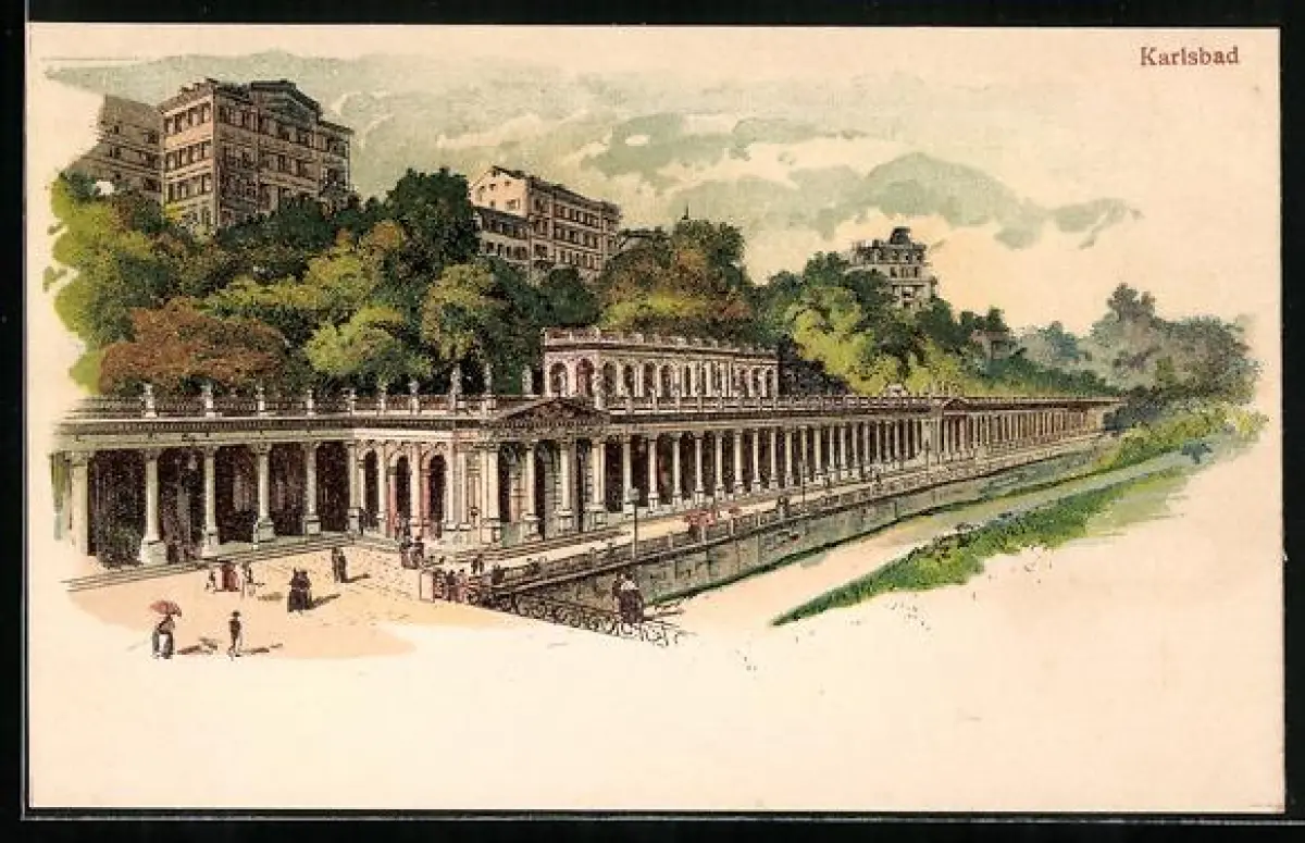 Lithographie Karlsbad, Ortsansicht aus der Vogelschau