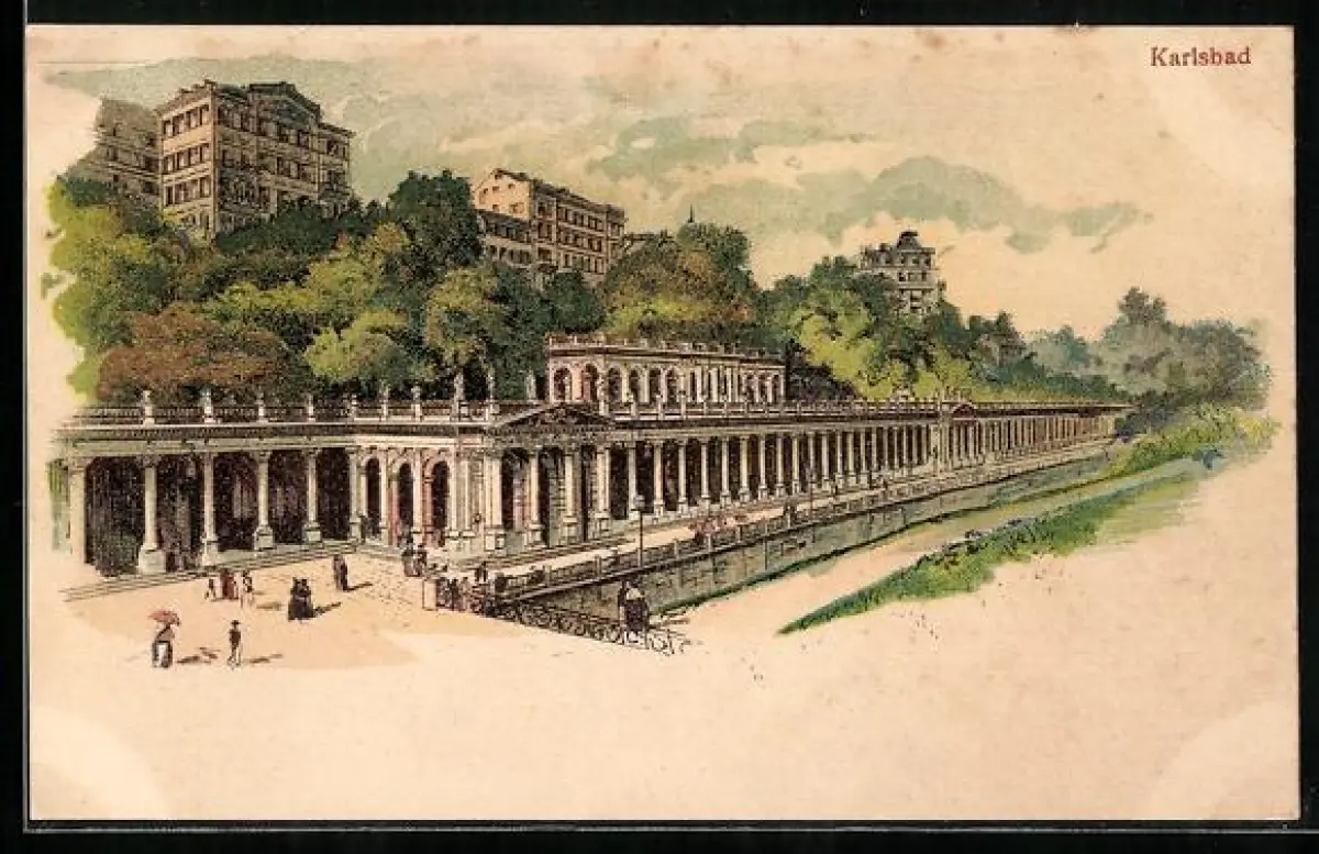 Lithographie Karlsbad, Ortspartie mit Promenade