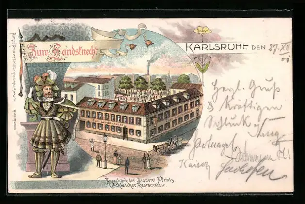Lithographie Karlsruhe, Gasthaus zum Landsknecht von I. Schleicher