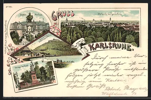 Lithographie Karlsruhe, Kriegerdenkmal, Scheffeldenkmal, Gesamtansicht