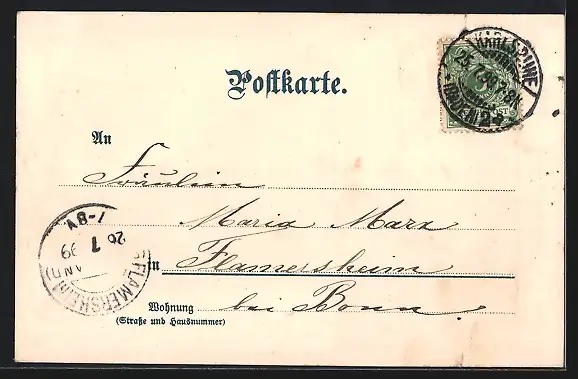 gelaufen 1899, Einriss unten li., Stempelspur, guter Zustand