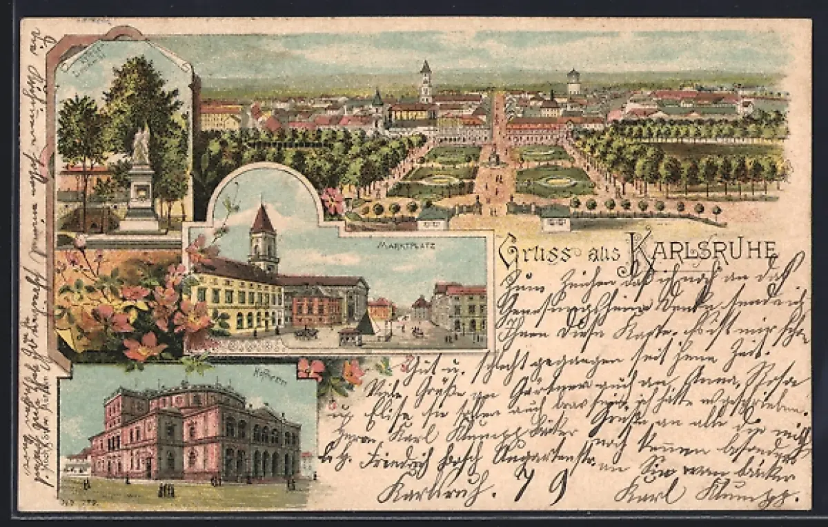 Lithographie Karlsruhe, Schloss, Marktplatz, Theater