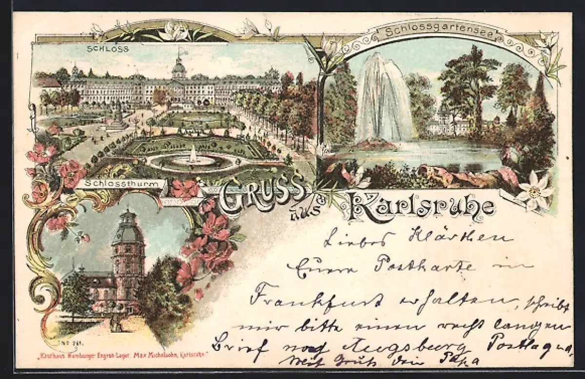 Lithographie Karlsruhe, Schloss, Schlossgartensee, Schlossturm