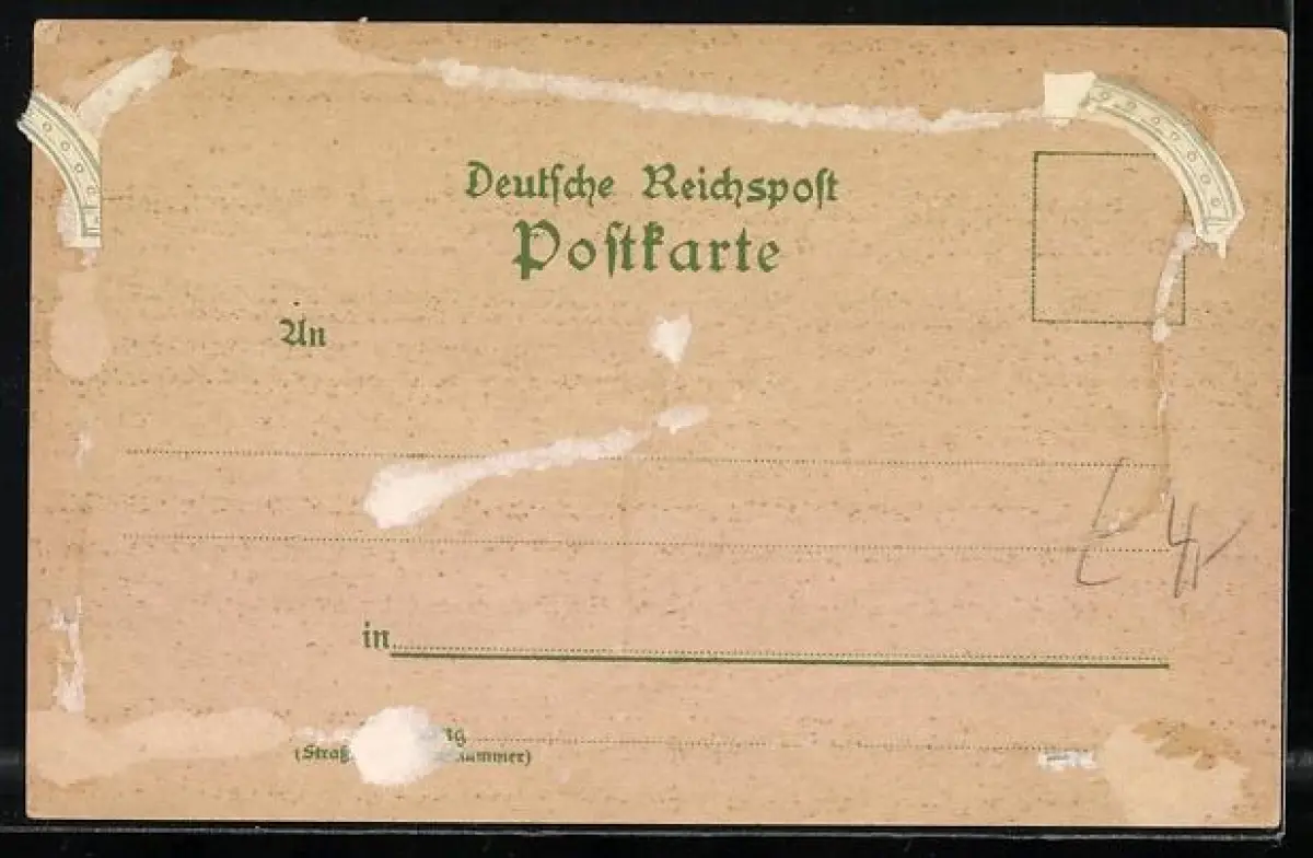 Personenbezogene Daten auf der Rückseite der Karte wurden durch blauen Textmarker unkenntlich gemacht. Die blauen Stellen sind auf die Vorderseite durchgeweicht und wirken sich negativ auf das Postkartenfoto aus