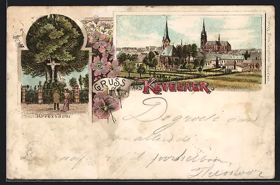 Lithographie Kevelaer, Kreuzbaum, Teilansicht mit Kirchen