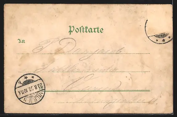 gelaufen 1897, Briefmarke entfernt, Bugspuren Ecke li. oben und re. unten, leicht fleckig