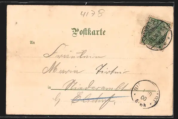Personenbezogene Daten auf der Rückseite der Karte wurden durch blauen Textmarker unkenntlich gemacht. Die blauen Stellen sind auf die Vorderseite durchgeweicht und wirken sich negativ auf das Postkartenfoto aus