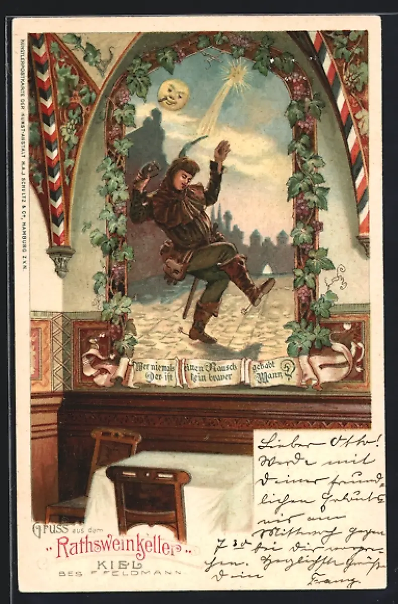 Lithographie Kiel, Gasthaus Rathsweinkeller, Betrunkener, Gedicht