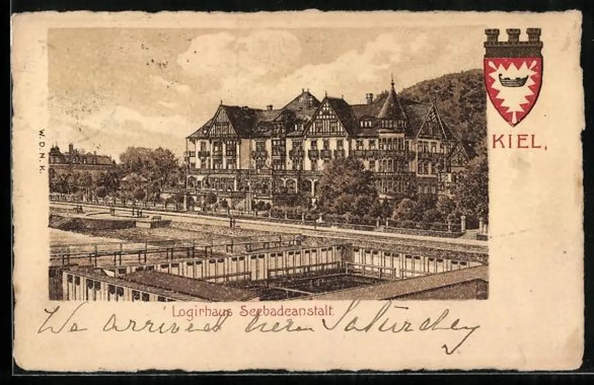 Lithographie Kiel, Logirhaus, Seebadeanstalt, Wappen