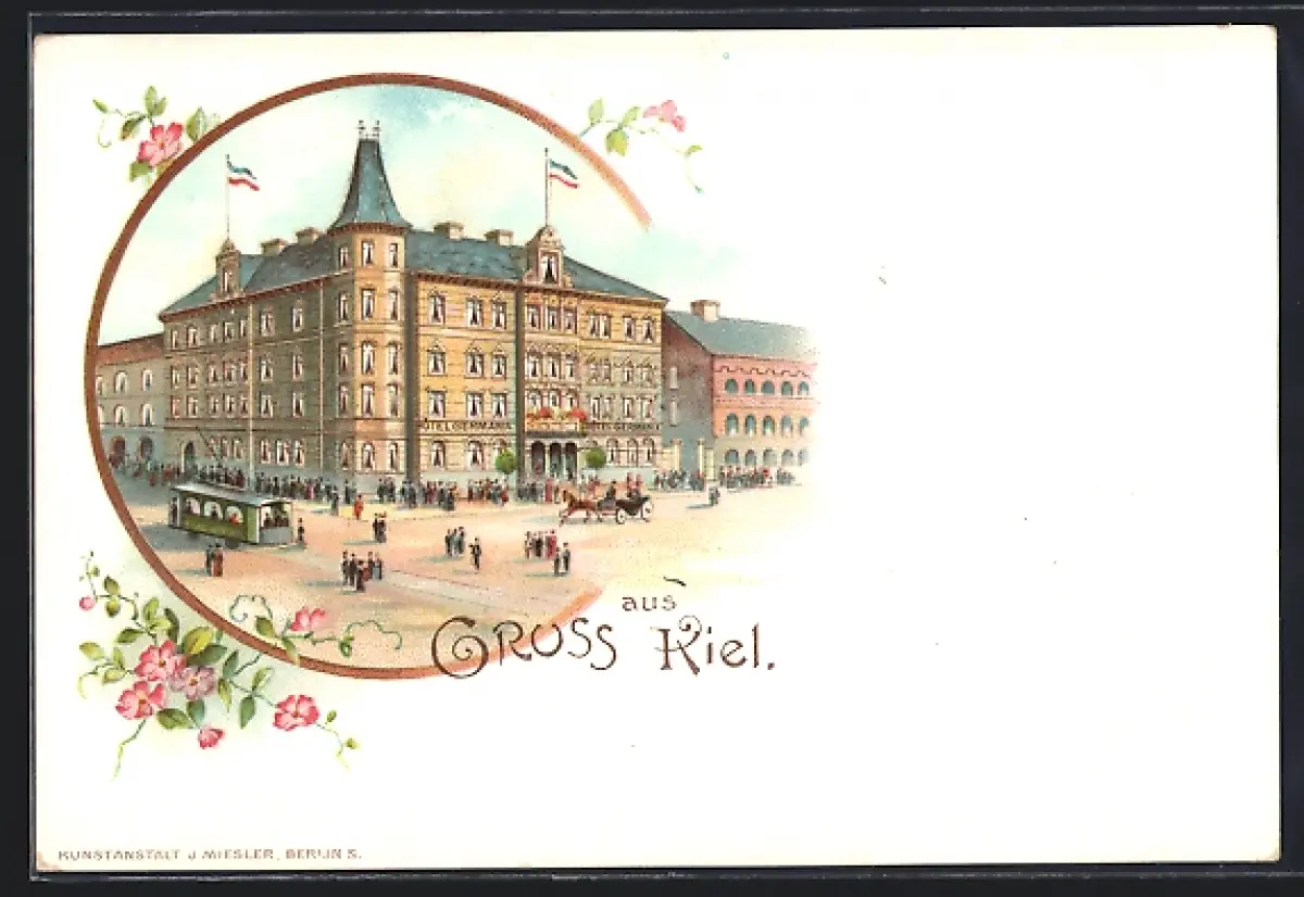 Lithographie Kiel, Partie am Hotel Germania mit Strassenbahn