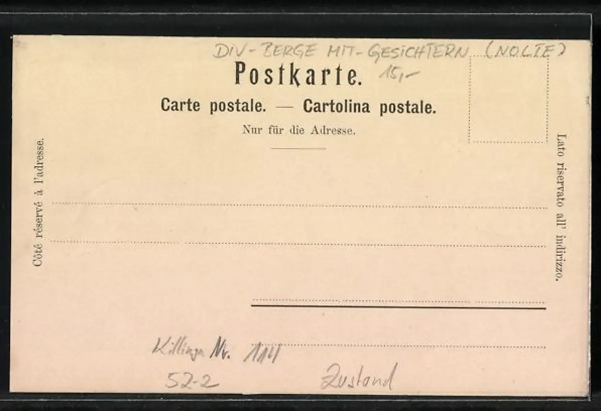 Lithographie Killinger Nr. 114, Eiger, Mönch und Jungfrau mit Weingläsern, Berg mit Gesicht, Berggesichter