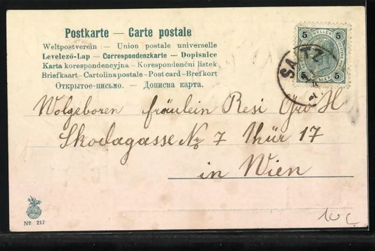 Personenbezogene Daten auf der Rückseite der Karte wurden durch blauen Textmarker unkenntlich gemacht. Die blauen Stellen sind auf die Vorderseite durchgeweicht und wirken sich negativ auf das Postkartenfoto aus