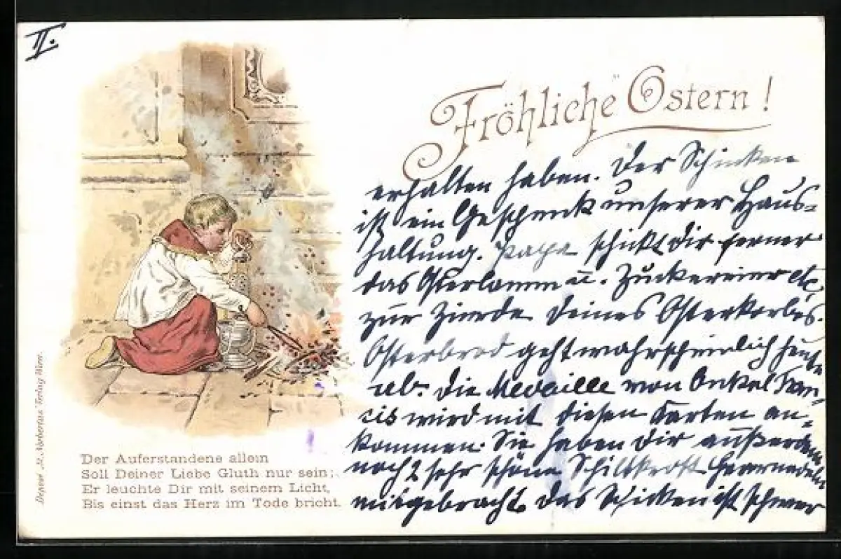 Lithographie Kind mit Weihrauch in einer Kirche, Gedicht, Fröhliche Ostern