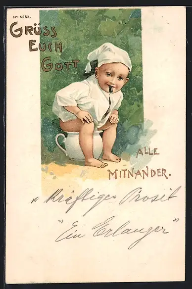 Lithographie Kind mit Zipfelmütze auf Nachttopf, Toilettenhumor