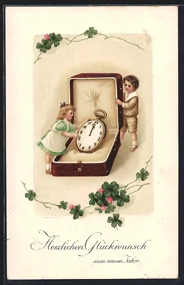 Lithographie Kinder an einer Schatulle mit Taschenuhr