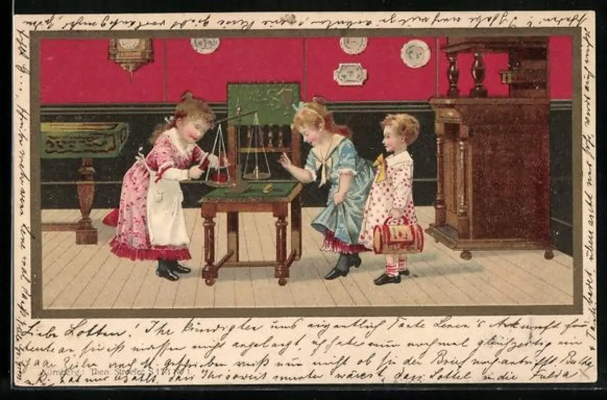 Lithographie Kinder spielen mit einer Waage
