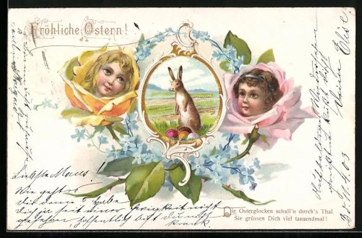 Lithographie Kinderköpfe in Rosenblüten, Osterhase mit Ostereiern, Ostergruss