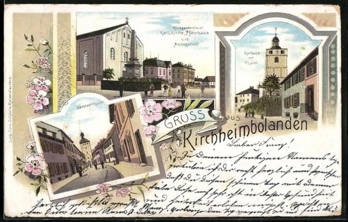 Lithographie Kirchheimbolanden, Rathaus mit Thurm, Kriegerdenkmal, Kath. Kirche, Pfarrhaus und Amtsgericht, Vorstadtturm