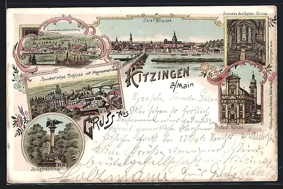 Lithographie Kitzingen, Protest. Kirche, Totale, Kriegerdenkmal