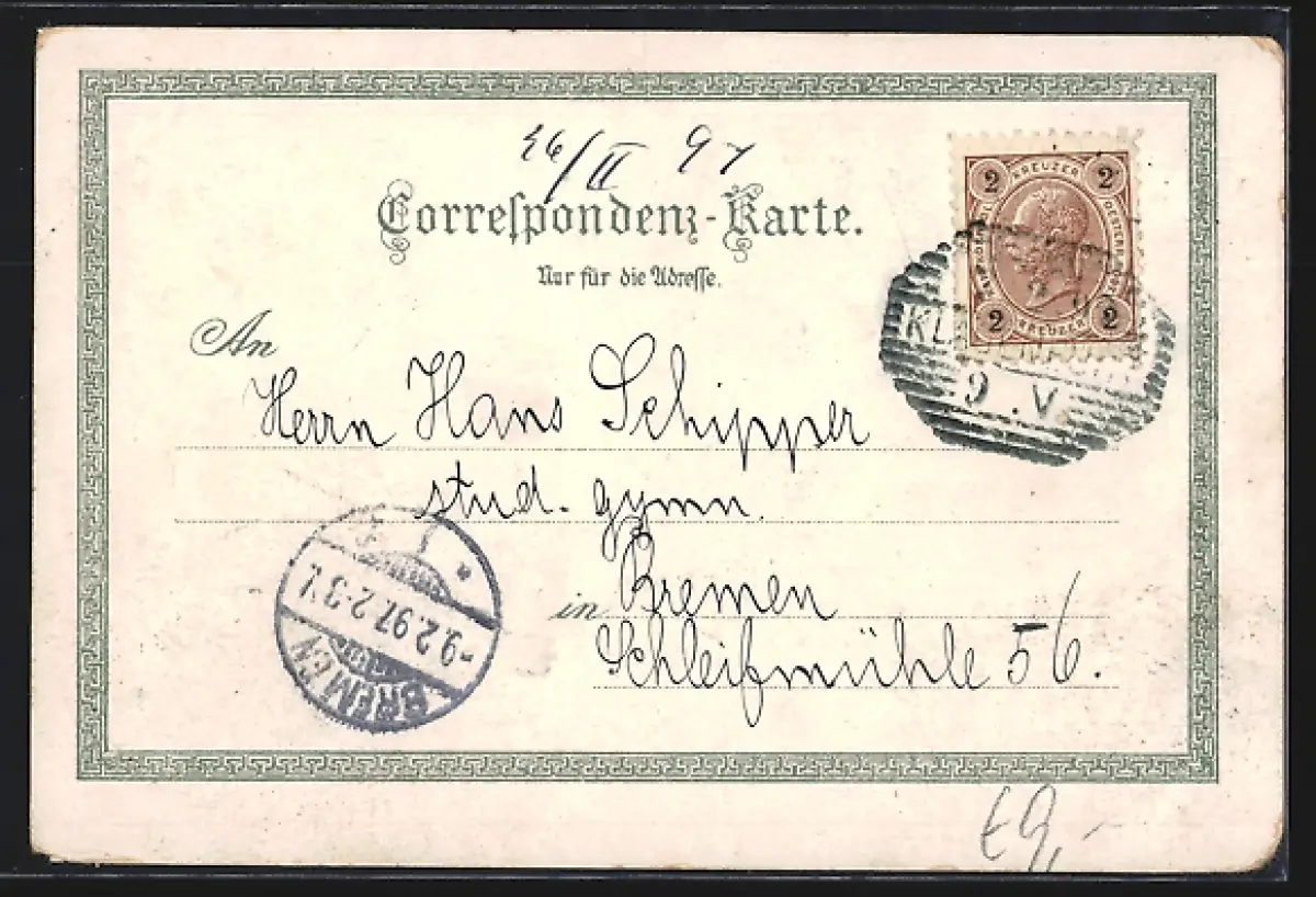 Personenbezogene Daten auf der Rückseite der Karte wurden durch blauen Textmarker unkenntlich gemacht. Die blauen Stellen sind auf die Vorderseite durchgeweicht und wirken sich negativ auf das Postkartenfoto aus