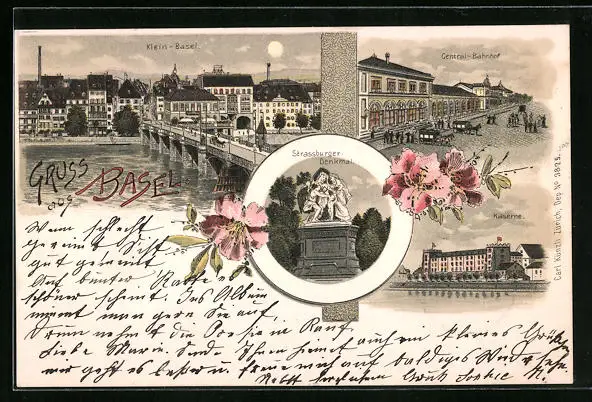 Lithographie Klein-Basel, Teilansicht mit Brücke bei Mondschein, Strassburger-Denkmal, Central-Bahnhof