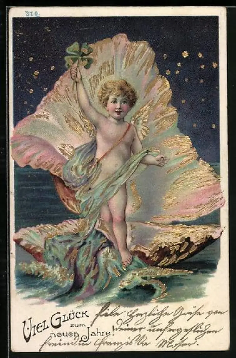 Lithographie Kleiner Neujahrsengel mit Kleeblatt steigt aus Muschel, Viel Glück im neuen Jahre