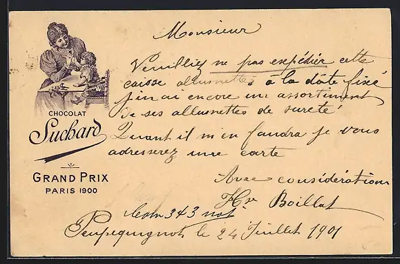 Lithographie Kleines Kind will Chocolat Suchard von der Mutter